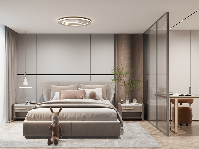 白色护墙板、暖灰色床品搭配一抹绿色植物,在安静中平添一份活泼,于沉稳中注入一种艺术。