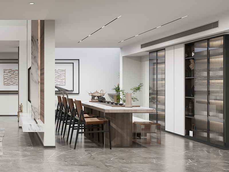 开放式茶室的材质和色彩决定了空间的功能性,与储物柜相呼应,形成既开放又相对独立的功能空间。